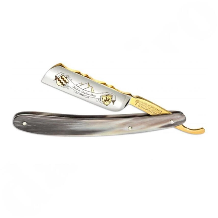 Das außergewöhnliche 6/8 ″ Rasiermesser und symbolisiert den Tod von Adolfo III., Graf von Berg während des fünften Kreuzzugs in Ägypten. Den Abschluss der polierten Klinge bildet ein französischer Kopf, der die besondere Eleganz dieses Messers unterstreicht. Handverlesene Hirschschuppen mit zusätzlichen Ziernieten, der aufwendige Klingenrücken und die partielle Vergoldung (24 Karat) sind nur einige der Highlights dieses Freihandrasierers. Lieferung mit edlem Präsentationsdisplay, Echtheitszertifikat und individueller Seriennummer.