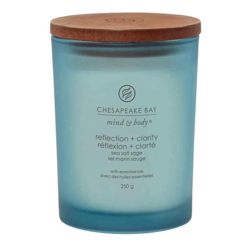 Aquatischer Duft! Die „Reflection & Clarity Sea Salt Sage“ Duftkerze von Chesapeake Bay erfrischt den Geist mit inspirierenden Noten von Meersalz, Muskatellersalbei und taufrischen Alpenveilchen.