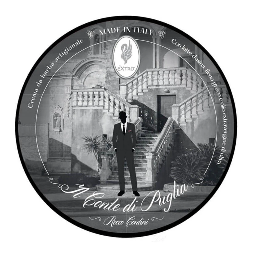 Der Il Conte di Puglia Rasiercreme mit einer Basis, angereichert mit Eselsmilch, Bockshornklee und extra nativem Olivenöl zu Ehren des Landes Apulien.