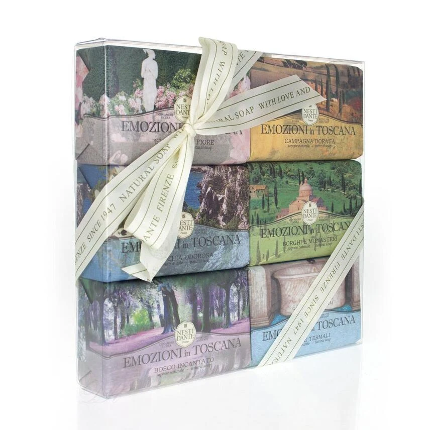 Dieses Geschenkset von Nesti Dante umfasst alle sechs Seifen der Emozioni in Toscana-Reihe, die die Schönheit und das Ambiente der Toscana in verschiedenen Düften repräsentieren.