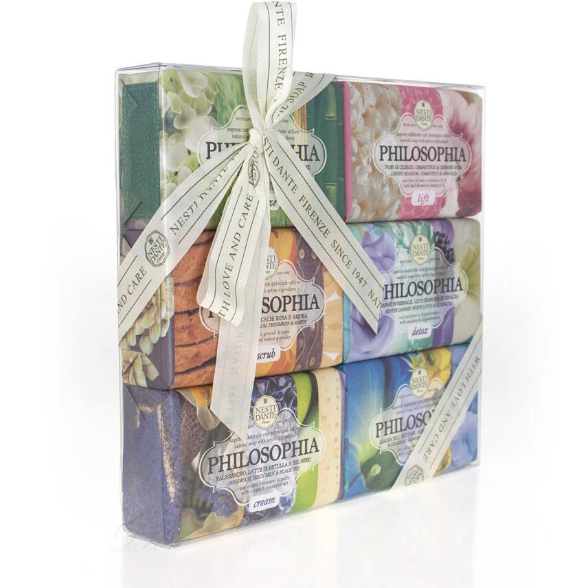 Dieses Set beinhaltet sechs Seifen der Philosophia-Linie von Nesti Dante. Die lift-Seife mit Bachblüten und Vitamin A + E, die detox-Seife mit Azulen und Spurenelementen, die breeze-Seife mit Chlorophyll und Bambus, die scrub-Seife mit Kleie und Walnussgranulat, die cream-Seife mit Creme und Perlenextrakten sowie die collagen-Seife mit planzlichem Kollagen ung Ginseng.